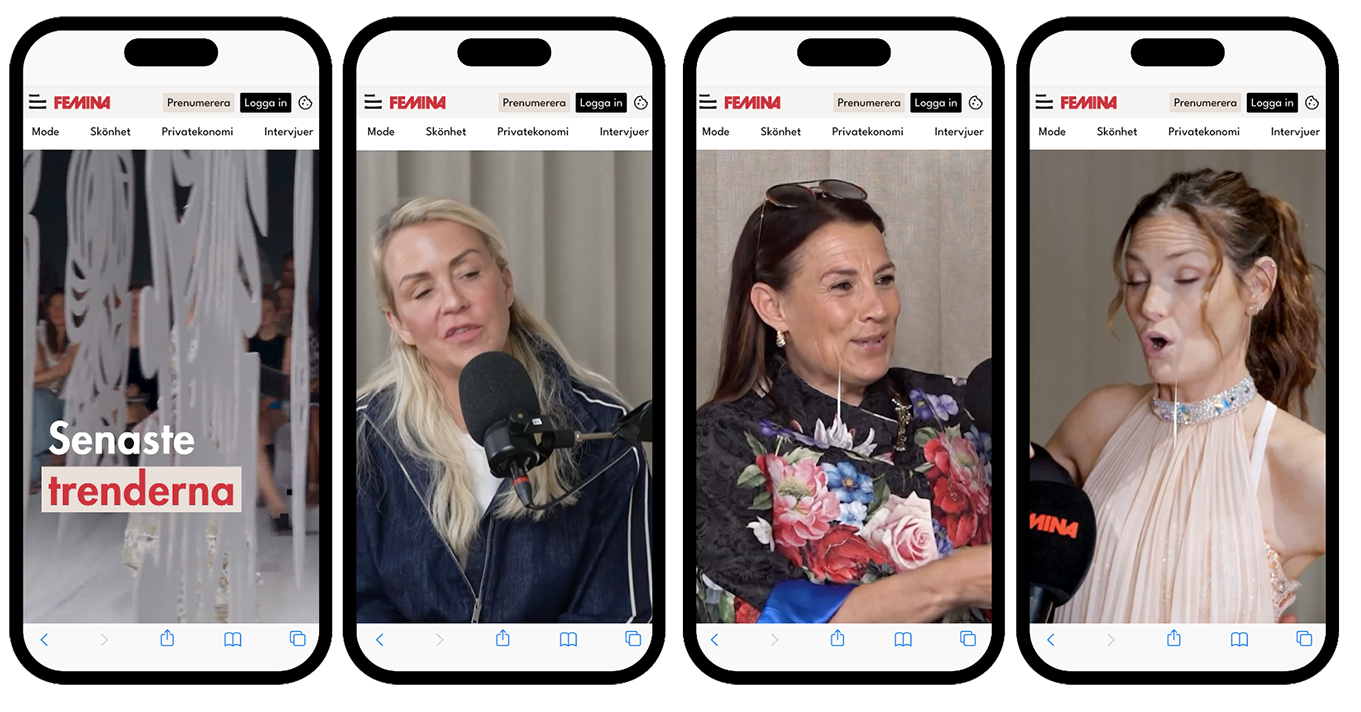 We created a branding campaign for Femina through four different highlights, where we chose to highlight important topics they cover and write about. We went through basically all the video material Femina had created to select the strongest and most important quotes and sequences. With that material, we made four short videos in 9:16 format with a focus on: Fashion, Award-winning journalism, Women’s health and Economics.